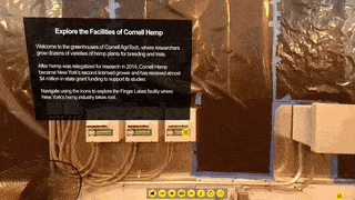 This is a tour of a Cornell University hemp growing facility used for their research. Through the use of 360 video, informational hotspot and integrated photos, the viewer in completely immersed into an unfamiliar world where they can explore freely while learning valuable and interesting information.